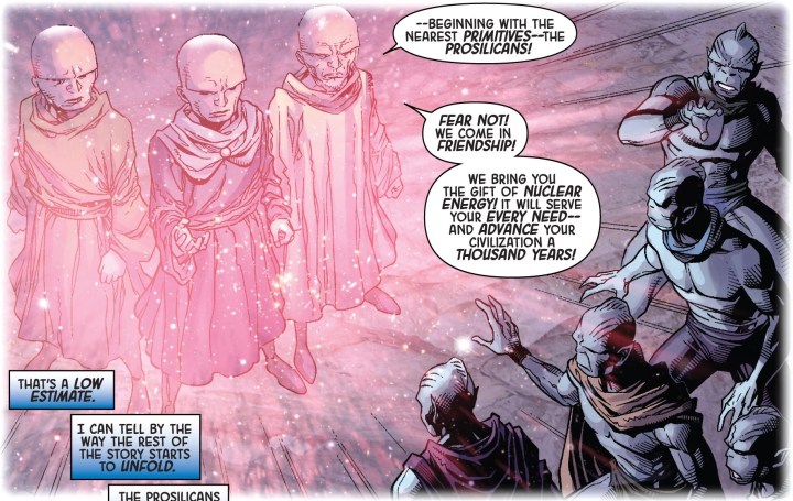 In Original Sin (2014) #0, the Watchers brings nuclear power to the Prosilicans. Marvel Comics.